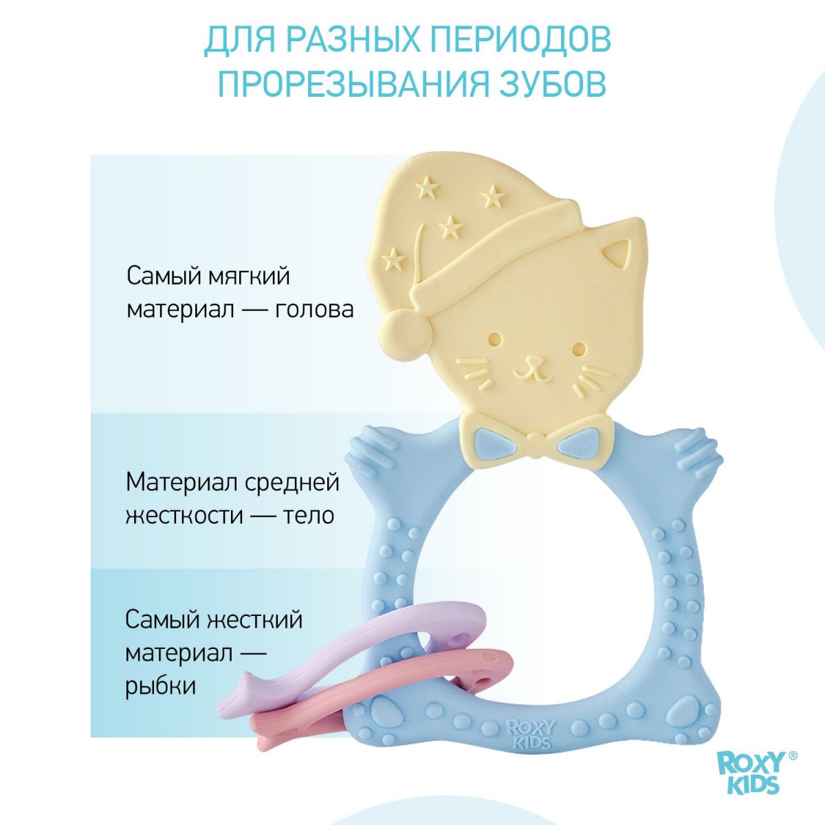 Прорезыватель для зубов MEOW TEETHER от ROXY-KIDS (голубой) подходит для всех стадий прорезывания зубов. Он состоит из элементов различной степени жесткости, что позволяет малышу использовать на протяжении всего времени прорезывания. На начальном этапе, когда у малыша раздражены десны, он может чесать их о мягкую рельефную голову Котика.