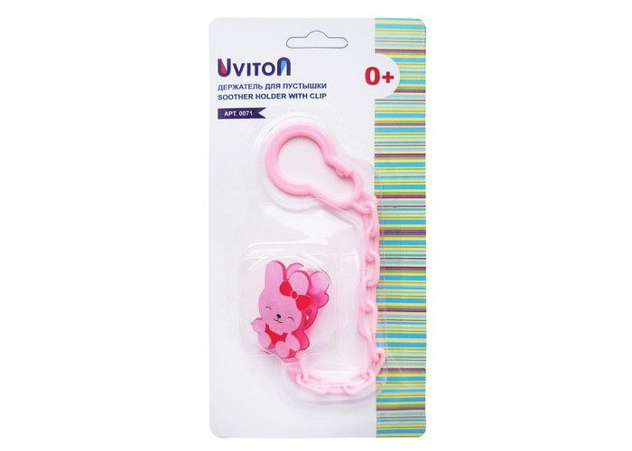 Uviton держатель для пустышки "Кролик" с помощью зажима надёжно крепится к одежде. Имеет безопасные закруглённые края, достаточную длину цепочки.