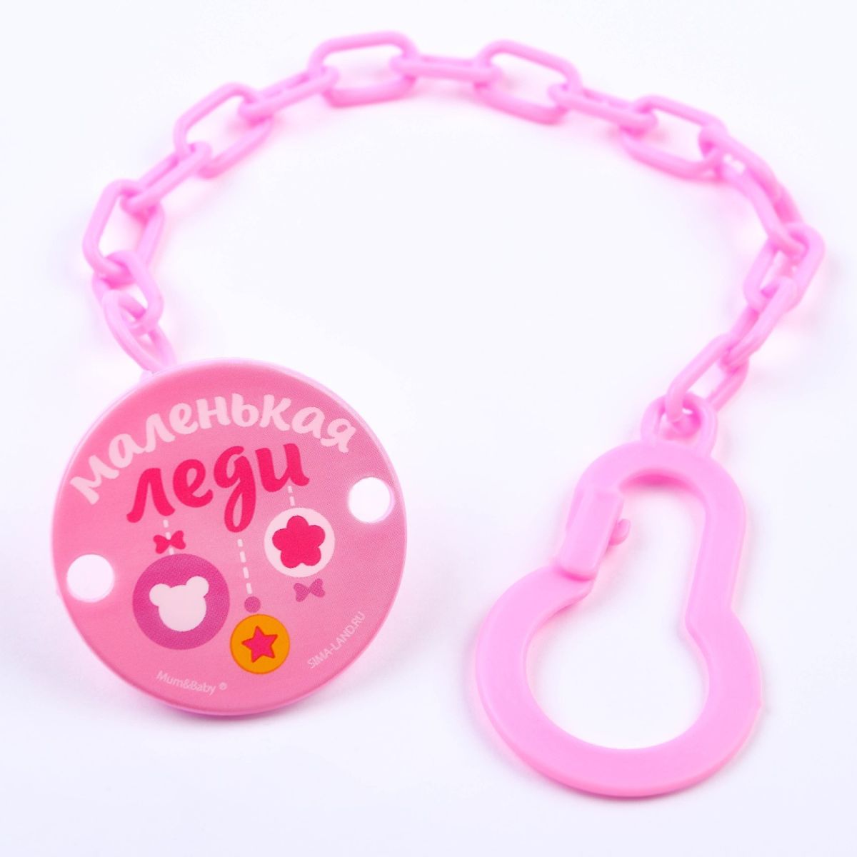 Изделие фиксируется на одежде ребёнка. На конце цепочки есть карабин, который зацепляется за кольцо пустышки. Надёжное крепление убережёт вещь от падения на пол, если малютка случайно выронит её изо рта.