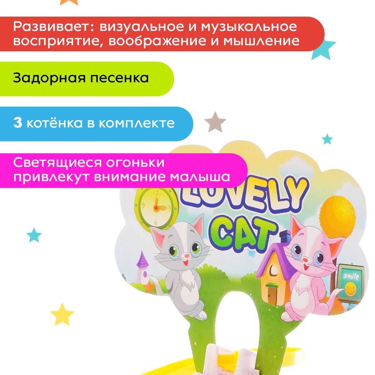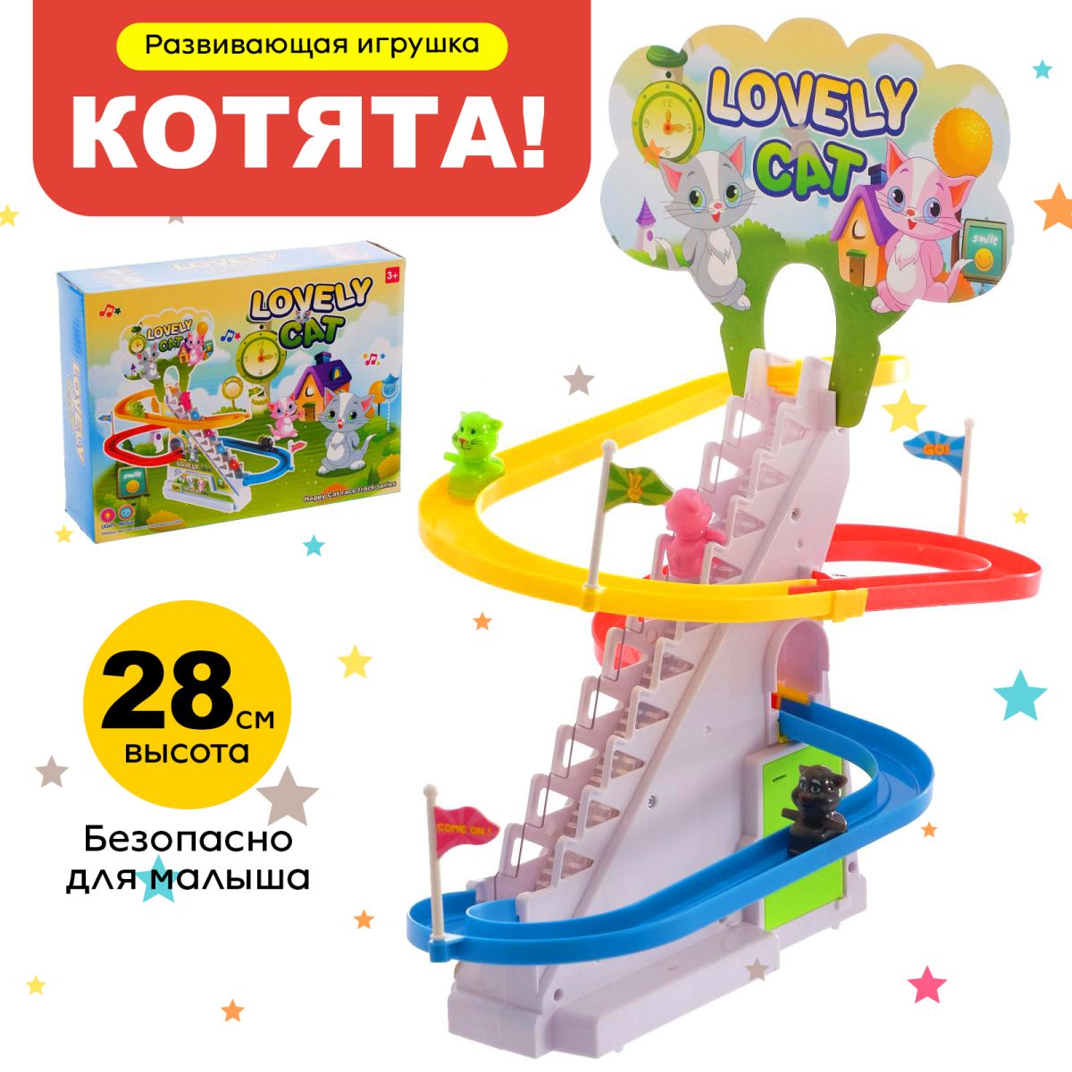 Вместе с малышом включайте игрушку и наблюдайте, как котики поднимаются по лесенке и скатываются с горки.