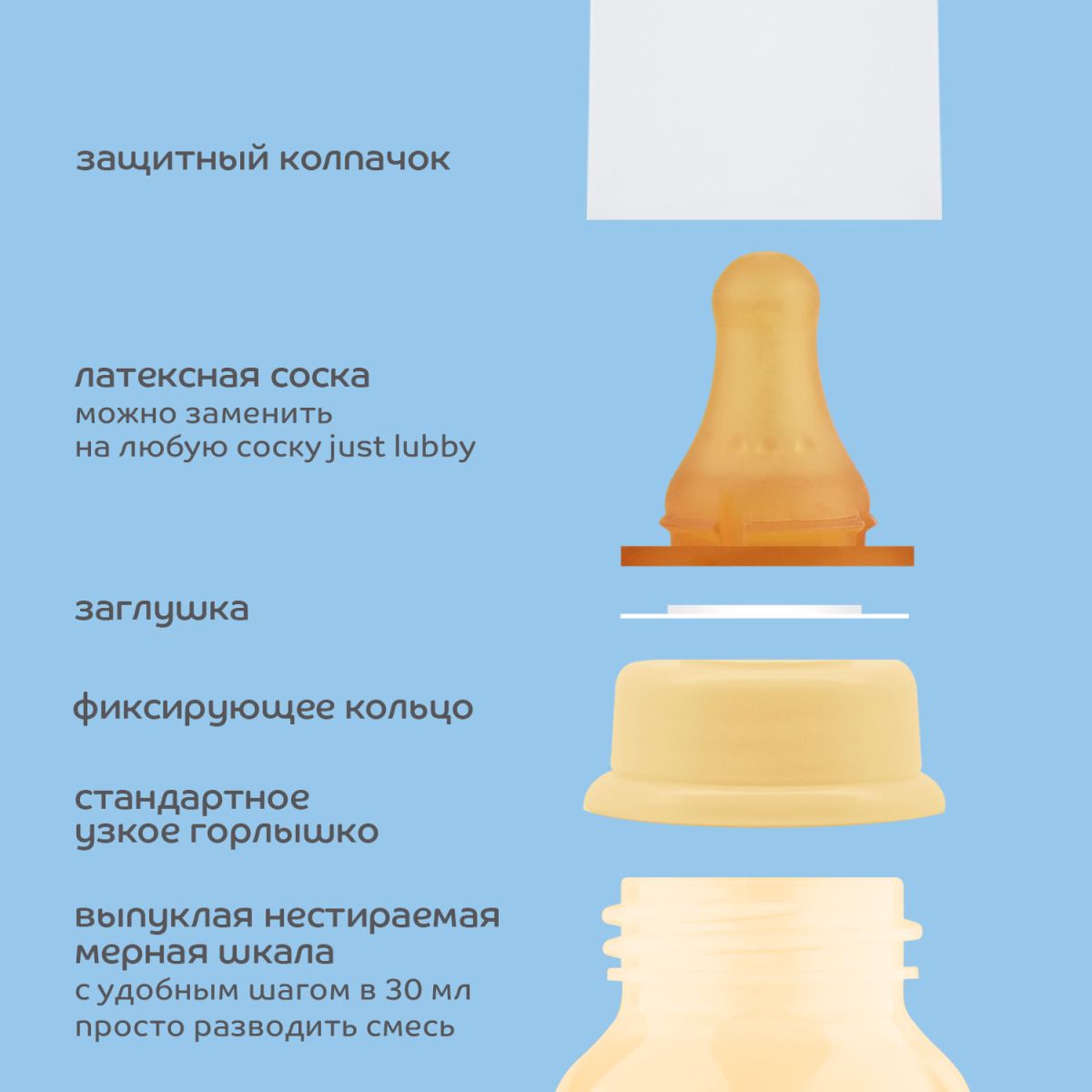К бутылочке подходят все молочные соски lubby как латексные, так и силиконовые для бутылочек со стандартным (узким) горлышком.