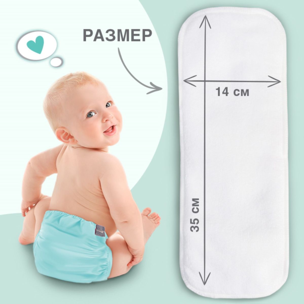 "Вкладыш предназначен для использования в комплекте с многоразовым подгузником. Края деликатно обработаны, а приятная на ощупь ткань не вызовет раздражения на нежной детской коже. Многоразовый подгузник — это трусики с регулируемым размером. Снаружи находится водонепроницаемый слой, а внутри — мягкий материал. После применения их легко постирать в машине. Вещь подойдёт для сторонников естественного пеленания. Такие изделия, как правило, рассчитаны на возраст до полутора лет. Они наиболее экономичны по сравнению с привычными предметами гигиены"