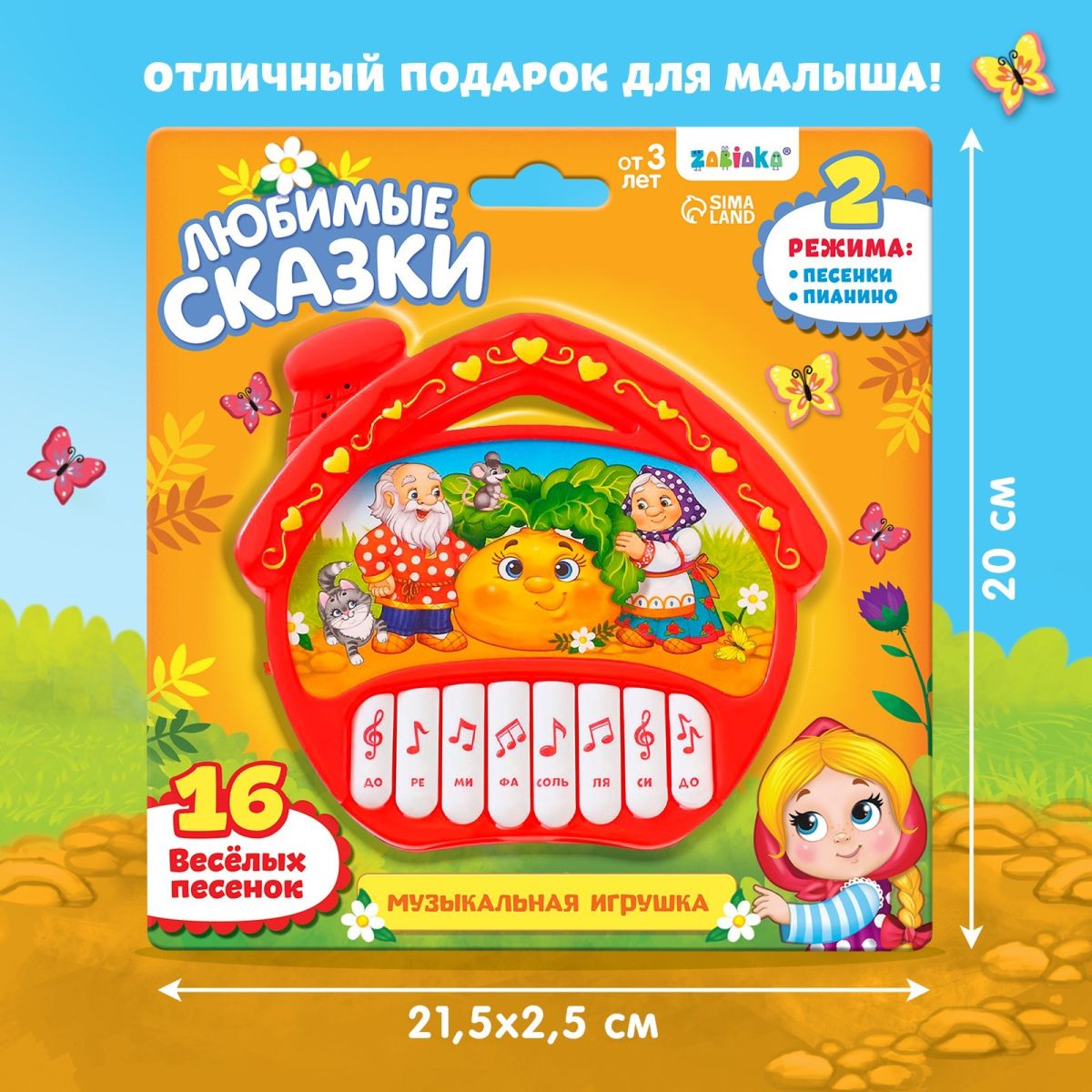 Работает в 2 режимах: устройство воспроизводит весёлые песенки-сказки и позволяет самостоятельно наигрывать мелодию на клавишах.