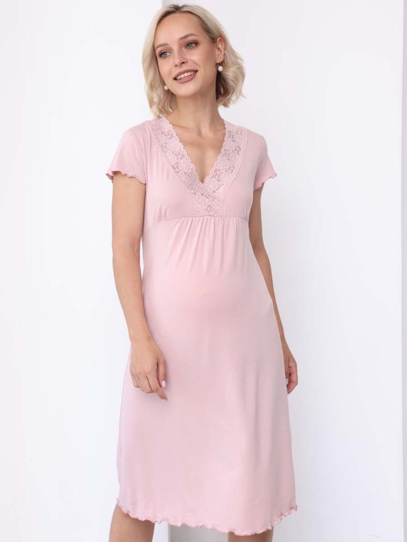 Комфортная ночная сорочка для беременных и кормящих женщин изготовлена из мягкой приятной к телу вискозы, украшена кружевом.