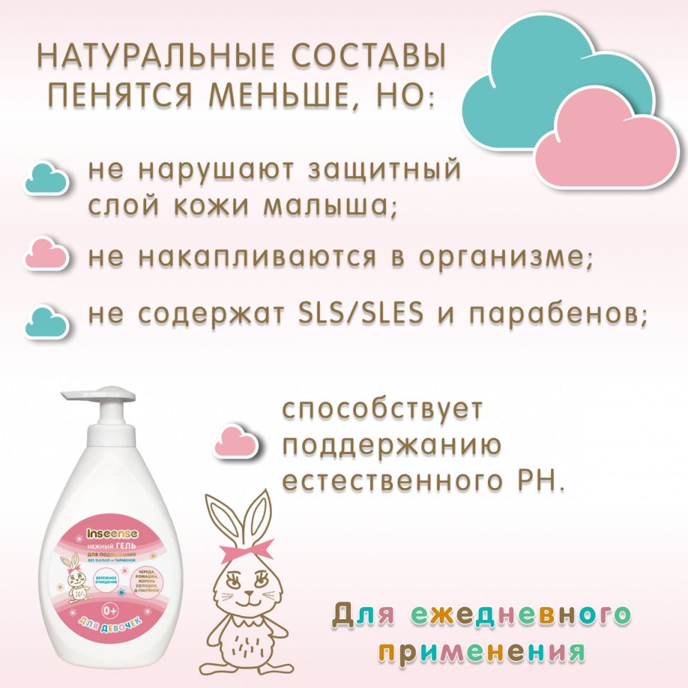 Нежный и мягкий гель для подмывания девочек Inseense рекомендован для ежедневного деликатного очищения и ухода за интимной зоной ребенка с первых дней жизни.