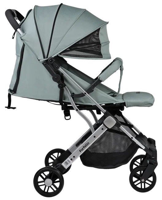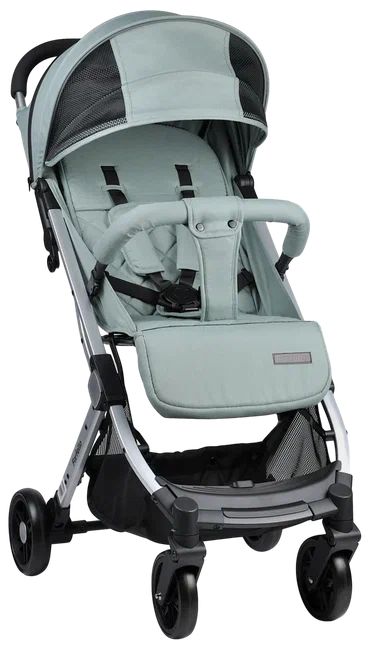 В сложенном состоянии прогулочная коляска стоит вертикально. Колеса изготовлены из материала EVA. Передние колеса вращаются на 360, что улучшает управляемость.