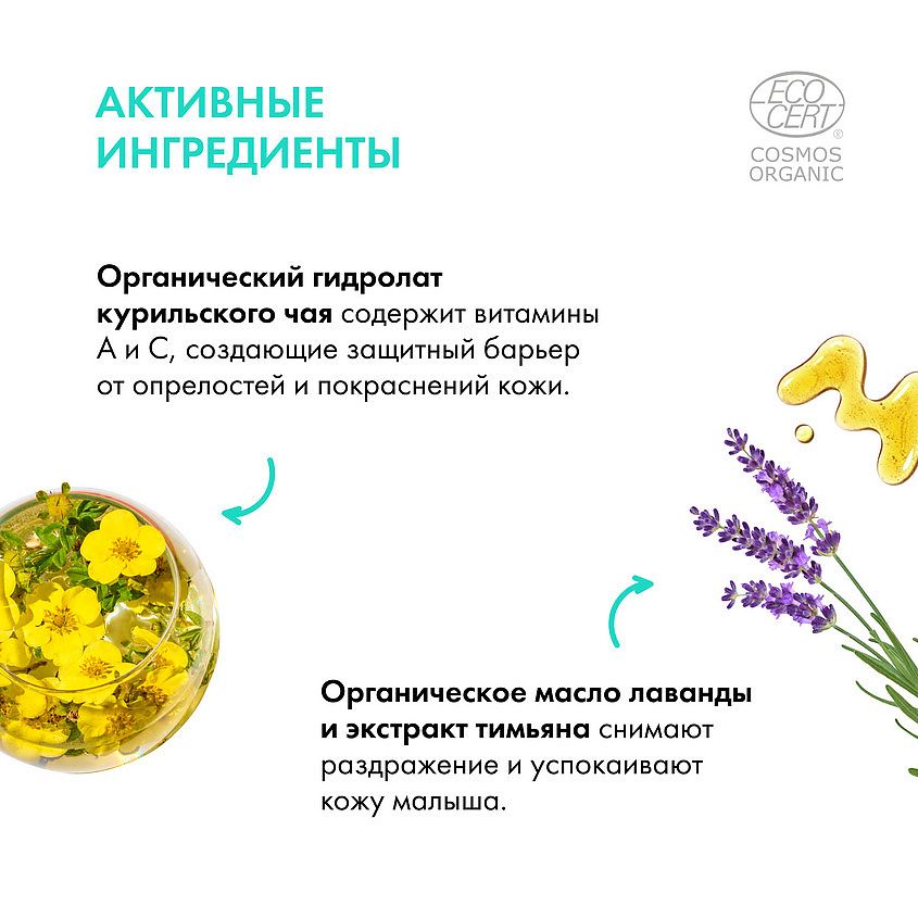 Органическое масло лаванды и экстракт тимьяна снимают раздражение и успокаивают кожу малыша.