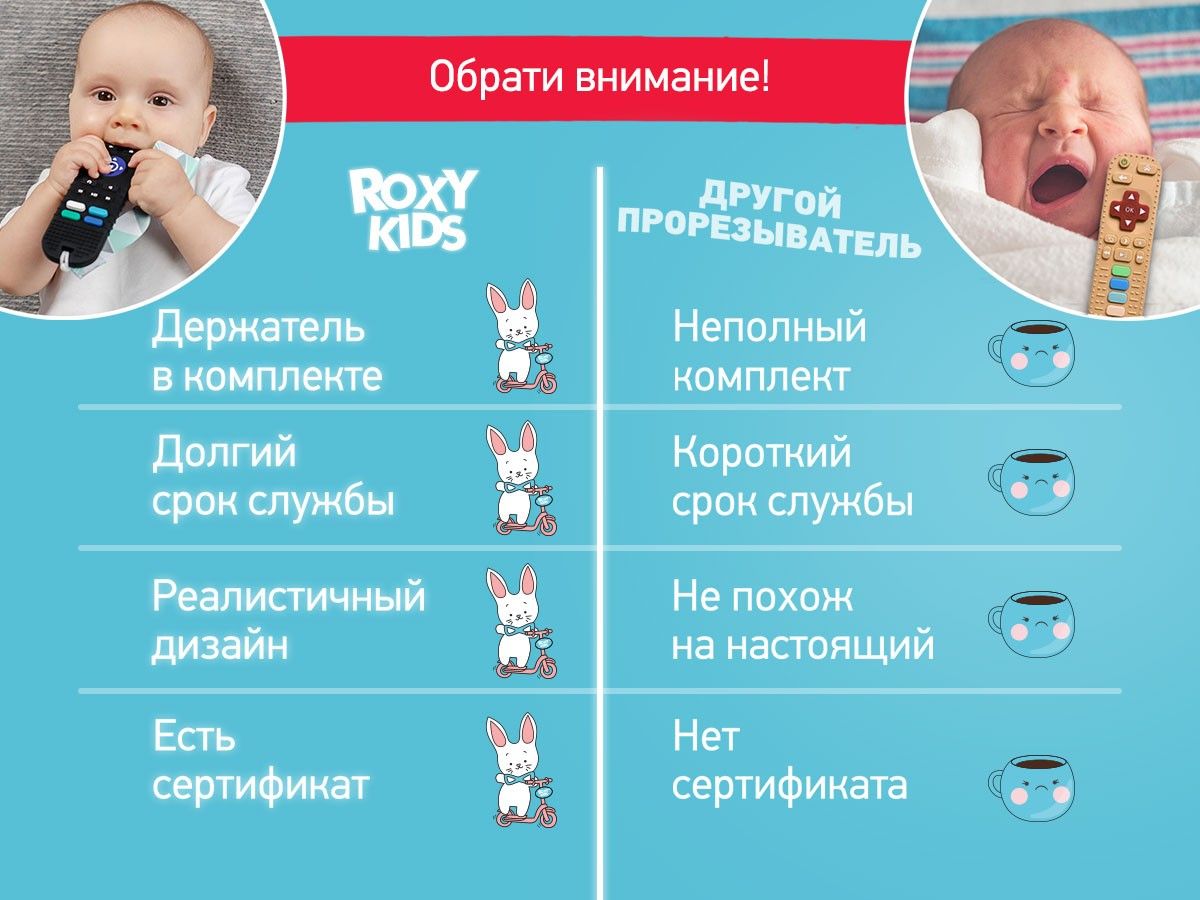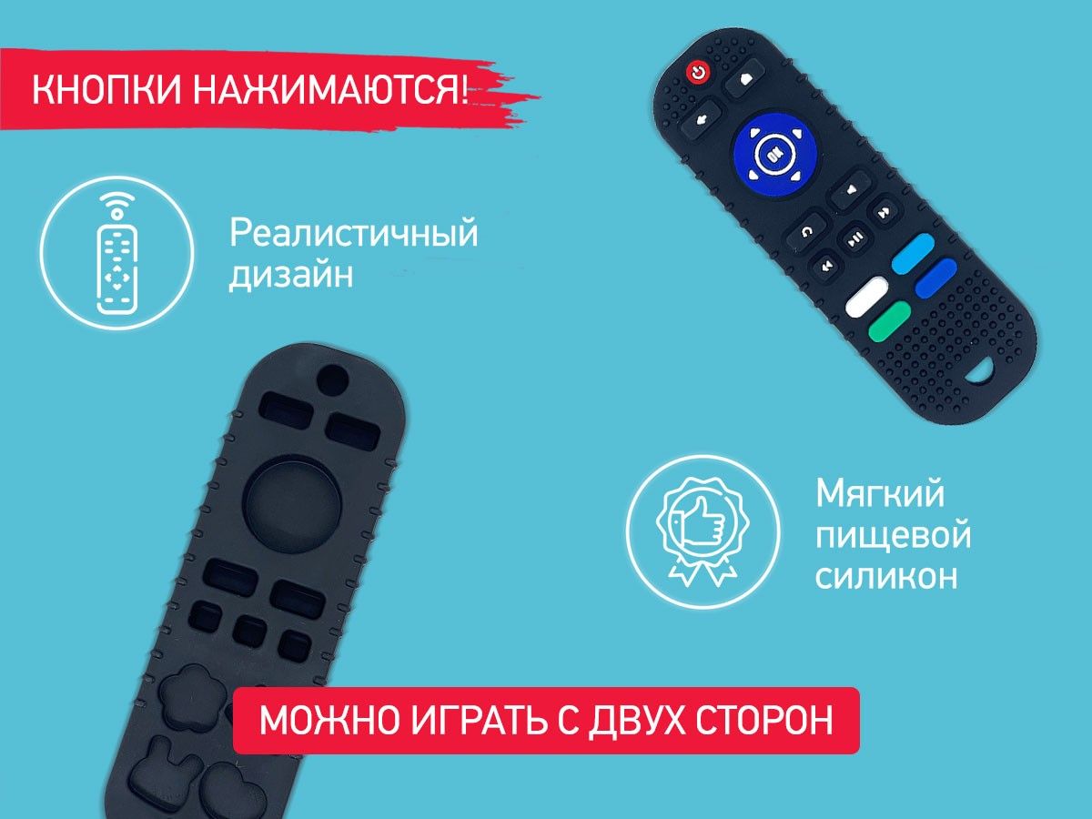 Реалистичный прорезыватель в виде ТВ-пульта от ROXY-KIDS – яркая и интересная игрушка, которая порадует вашего малыша и поможет снизить дискомфорт во время прорезывания зубов! Силиконовый ТВ-пульт выглядит как настоящий и надолго увлечет малыша. Рельефная поверхность эффективно массирует десны и зубки малыша, облегчая боль и зуд при появлении первых зубов. Использование прорезывателя поможет развить моторику рук, координацию движений, а также восприятие цвета и формы. Для еще большего удобства прорезыватель оснащен специальным отверстием для держателя и формой для приготовления льда с обратной стороны. Аксессуар изготовлен из гипоаллергенного пищевого силикона и подходит для ежедневного использования. В комплект входит держатель с надежной запатентованной клипсой, поэтому прорезыватель не упадет и не потеряется. Один конец держателя прикрепляется к прорезывателю, а второй при помощи специальной клипсы пристегивается к одежде ребенка. Держатель выполнен из двух слоев полиэстера, прочно сшитых вместе, поэтому он не износится и не порвется.