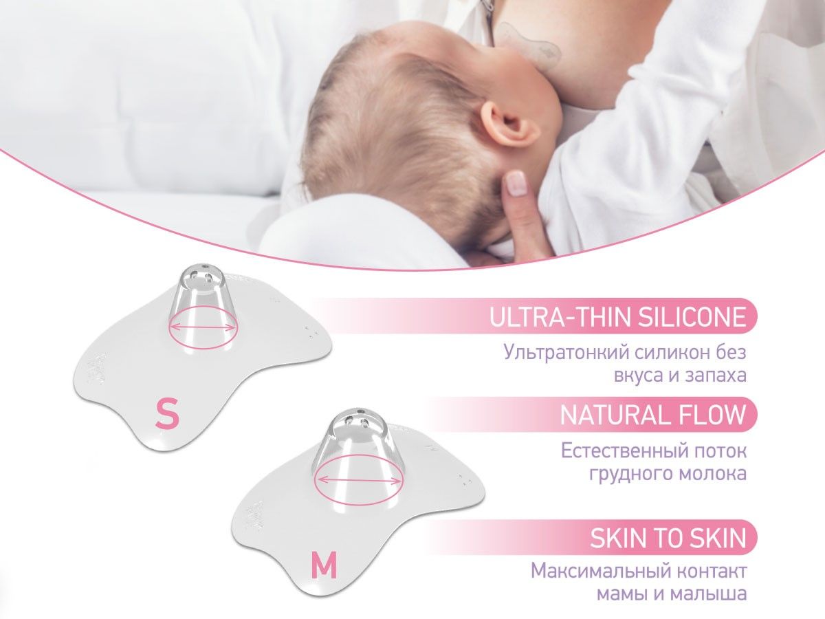 Защитные силиконовые накладки на соски избавят женщину от болезненных ощущений во время кормления грудью и защитят потрескавшиеся или воспаленные соски от травмирования. Накладки сделаны из тонкого и мягкого силикона, не имеют запаха и не влияют на вкус грудного молока. Особая форма накладок позволяет малышу ощущать запах и тепло материнской груди. После заживления сосков ребенок легко перейдет на кормление грудью без накладок. Пластиковый контейнер гарантирует удобное и гигиеничное хранение. В комплект входят 2 накладки размеров S и М. Как выбрать подходящий размер? Размер S предназначен для диаметра соска до 12 мм, а размер M для диаметра соска до 19 мм.