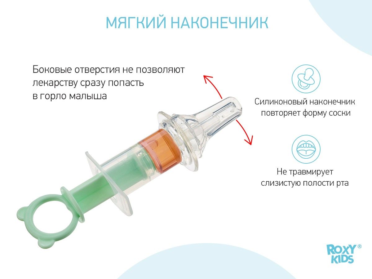 Дозатор для приема лекарств ROXY-KIDS поможет обеспечить комфортное введение малышу любых сиропов, лекарств и других жидкостей, если он отказывается их принимать. С помощью дозатора можно легко отмерить нужную порцию и контролировать скорость введения лекарства. Содержимое можно аккуратно ввести, пока ребенок будет увлеченно жевать силиконовый наконечник.