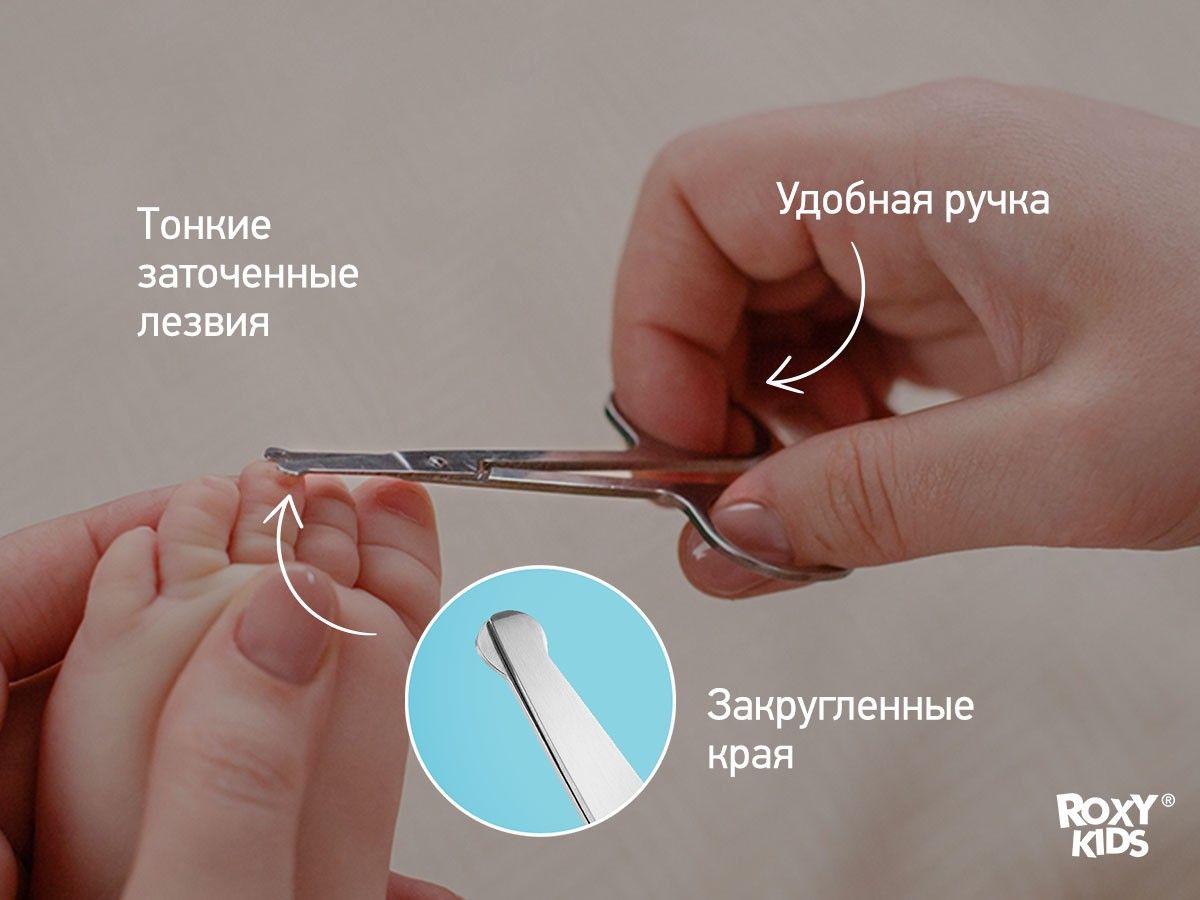 Маникюрные ножницы ROXY-KIDS разработаны для ухода за ногтями новорожденных с первых дней жизни. Ноготки младенцев настолько мягкие, что их могут срезать лишь действительно тонкие и острые лезвия. Маникюрные ножницы ROXY-KIDS изготовлены из нержавеющей стали с применением новейших технологий производства. Закругленная форма лезвий делает ножницы безопасными в использовании. Подстригайте ноготки, когда они отрастают на 1 мм, иначе малыш может себя поцарапать.