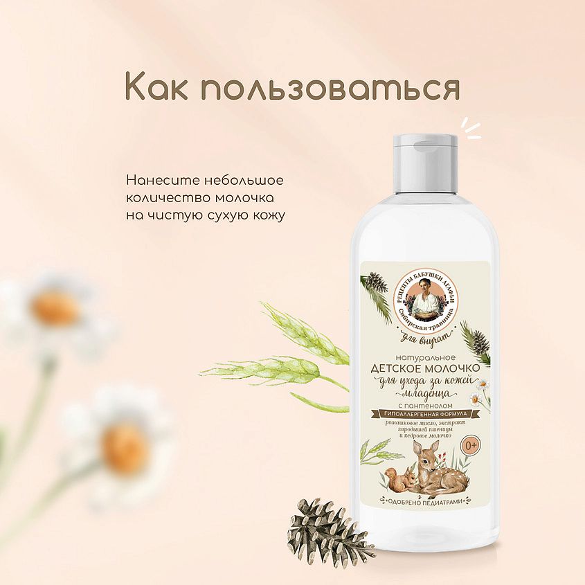 Нежной коже младенца требуется дополнительный уход и защита, особенно в условиях жизни в мегаполисе. Натуральное молочко имеет лёгкую текстуру, быстро впитывается, увлажняет и смягчает кожу. А лёгкие массажные поглаживания оказывают благотворное влияние на развитие малыша. Ромашковое масло оказывает антибактериальное, успокаивающее и расслабляющее действие, глубоко питает и смягчает кожу малыша. Экстракт зародышей пшеницы – источник незаменимых аминокислот и витаминов группы В. Он стимулирует обменные процессы в клетках, борется с шелушением и покраснением кожи. Кедровое молочко, богатое витамином Е, тонизирует и защищает кожу от неблагоприятного воздействия внешней среды. Пантенол оказывает мощное восстанавливающее действие, способствует регенерации клеток, увлажняет и ухаживает за кожей младенца.