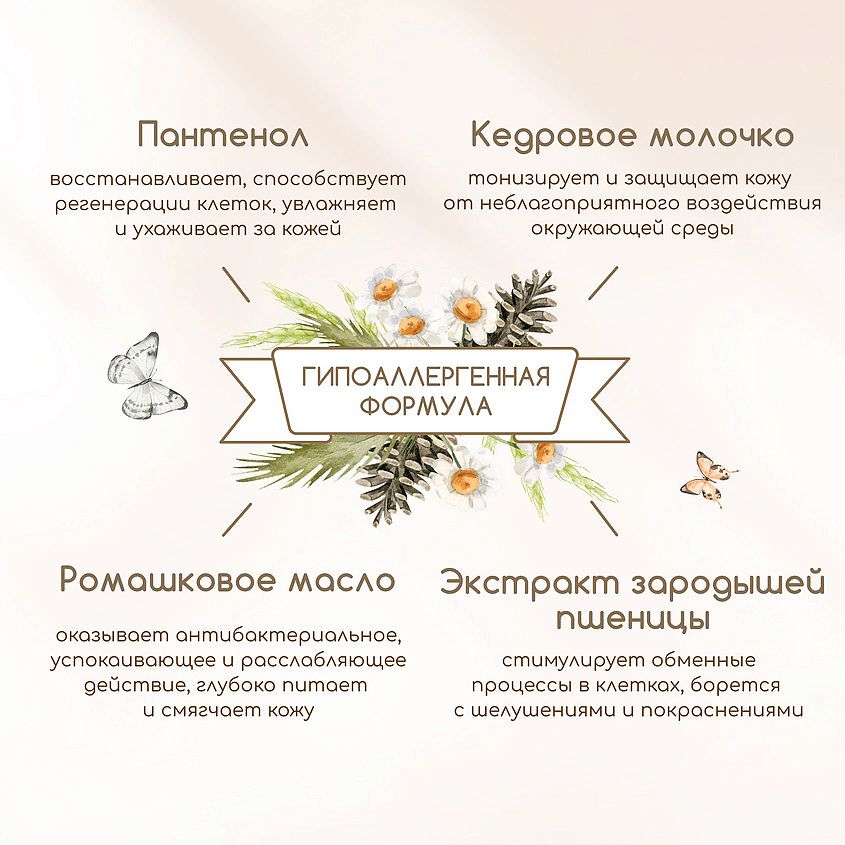 Aqua with infusions of Triticum Vulgare Germ Extract (экстракт зародышей пшеницы); Pinus Sibirica Needle Extract, Pinus Sibirica Seed Oil, Pinus Sibirica Seed Oil Polygliceryl-6 Esters (кедровое молочко), Bidens Tripartita Flower/Leaf/Stem Extract (экстракт череды), Helianthus Annuus Seed Oil, Chamomilla Recutita Oil (ромашковое масло), Glycerin, Cetearyl Alcohol, Glyceryl Stearate, Isopropyl Palmitate, Glyceryl Linoleate, Glyceryl Oleate, Glyceryl Linolenate (витамин F), Panthenol (пантенол), Octyldodecanol, Olive Glycerides, Ceramide NP (комплекс церамидов), Xanthan Gum, Sodium Stearoyl Glutamate, Benzyl Alcohol, Dehydroacetic Acid, Tocopherol (витамин Е), Citric Acid, Sodium Benzoate, Potassium Sorbate. Parfum, Citronellols, Coumarin.