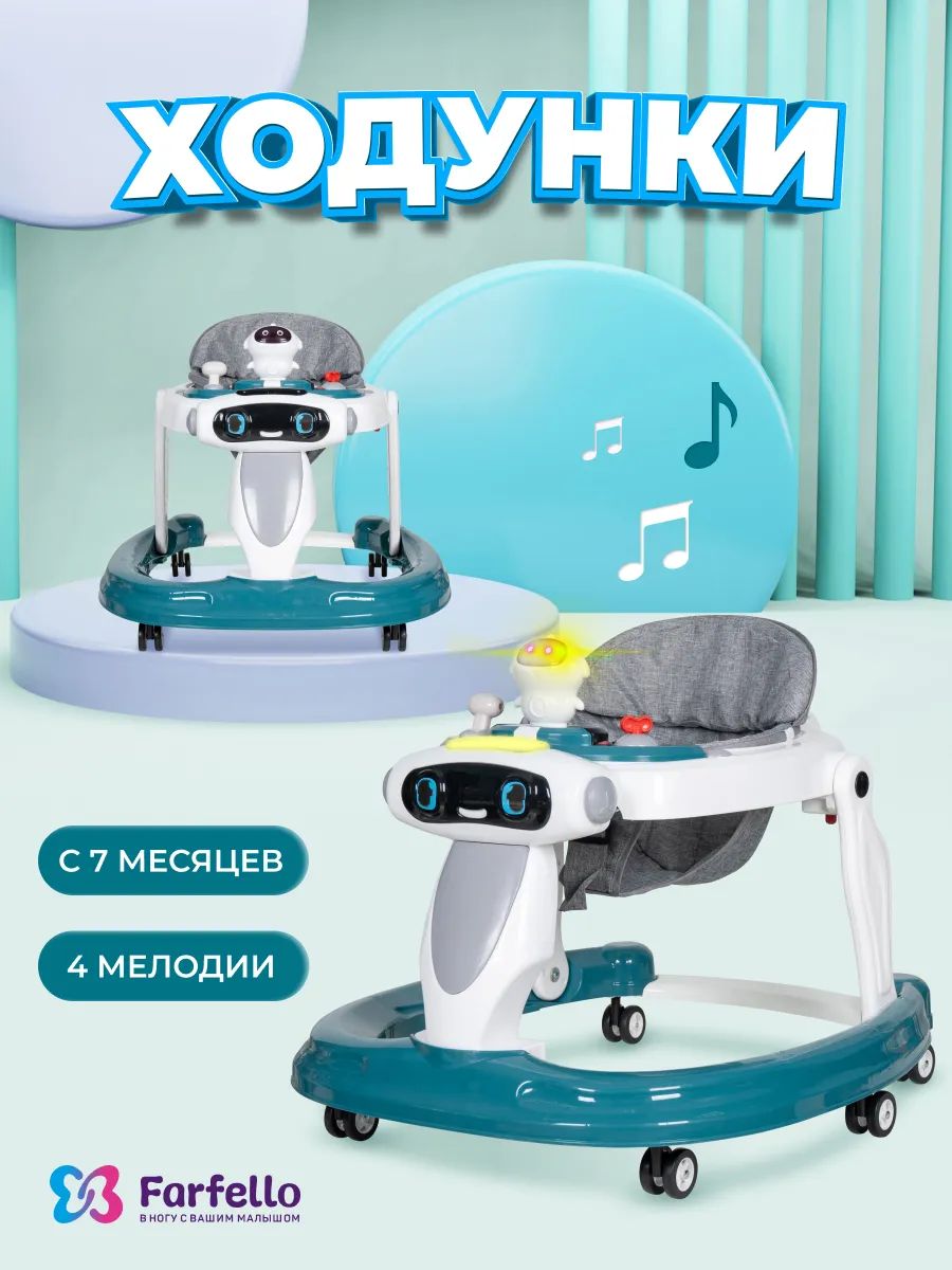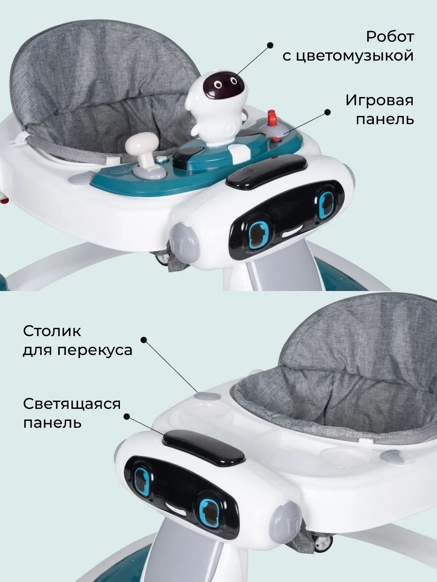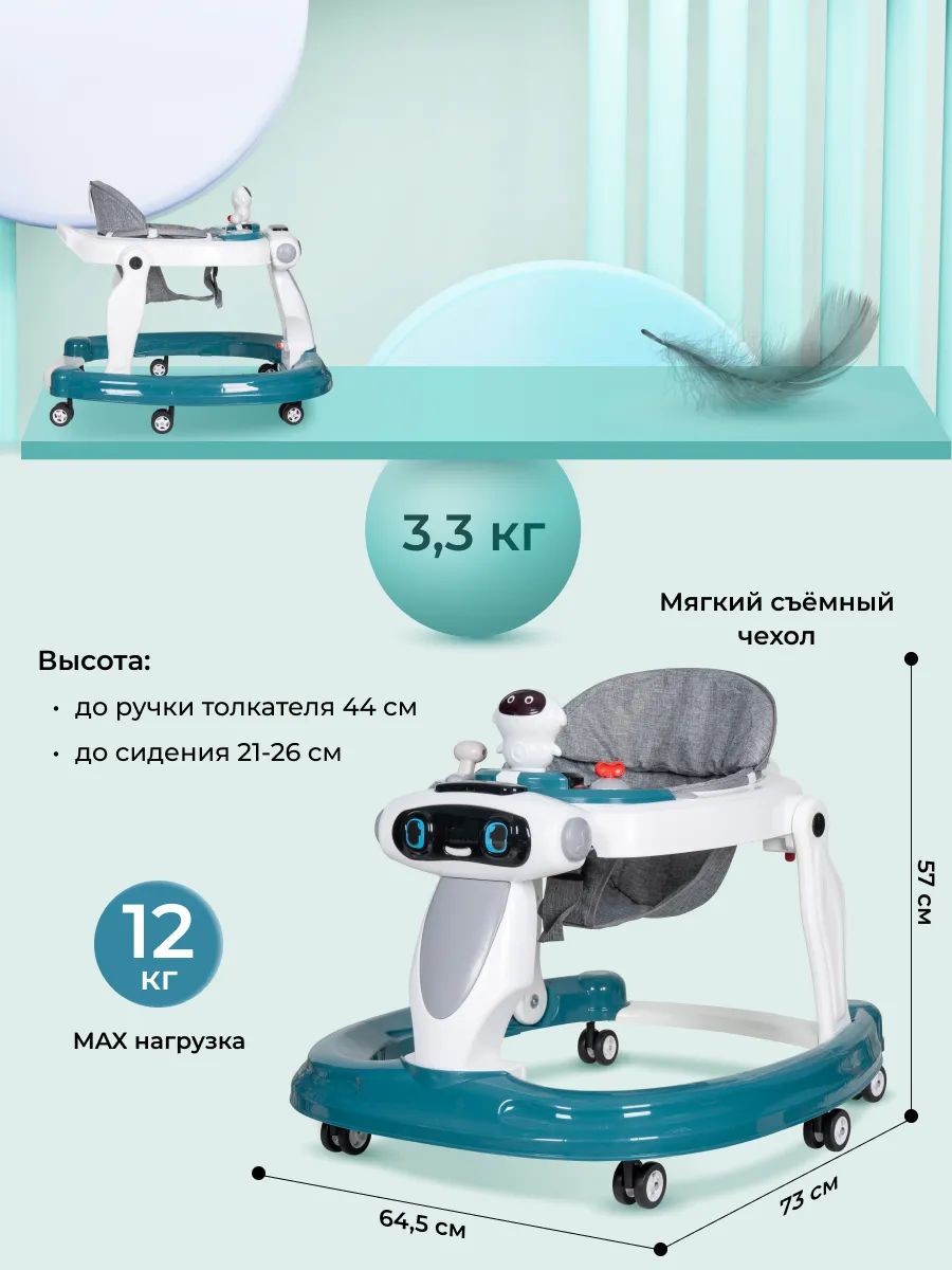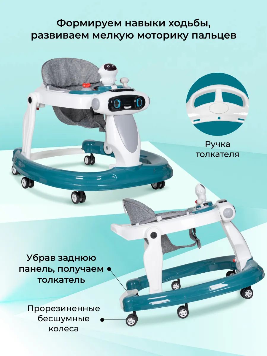 Материал сидения мягкий, приятный на ощупь и съёмный. 6 мягких колес позволят беспрепятственно перемещаться малышу в ходунках. Когда малыш начнёт ходить, то можно убрать нижнюю ось. На раме есть специальная ручка, за которую можно держаться. Ходунки будут выполнять роль передвижной опоры и ребёнок начнёт увереннее себя чувствовать при самостоятельной ходьбе.