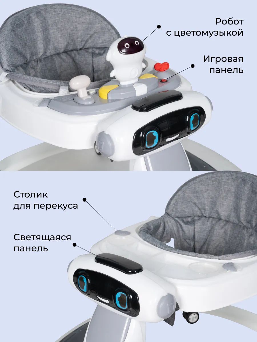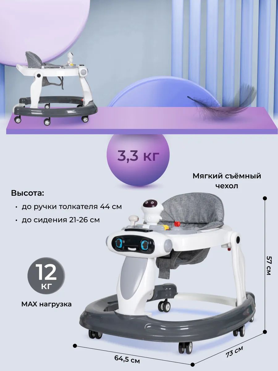 Детские ходунки К09 2в1 предназначены для детей от 7 до 18 месяцев, с максимальной нагрузкой до 12 кг. Устойчивая конструкция выполнена из качественного пластика, что обеспечивает ее ультралегкий вес, всего 3,3 кг. Игровая панель работает от батареек АА*2 шт (в комплект не входят), привлечет внимание ребенка яркими огоньками и весёлыми мелодиями. Так же есть небольшая светящаяся панель, которая включается красной кнопкой на корпусе под верхним основанием. Игровая панель меняется на многофункциональный органайзер.