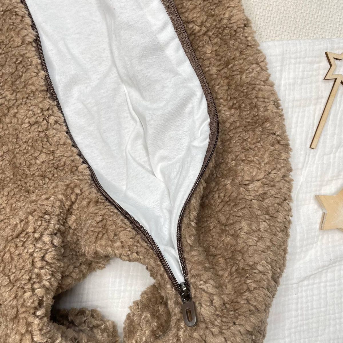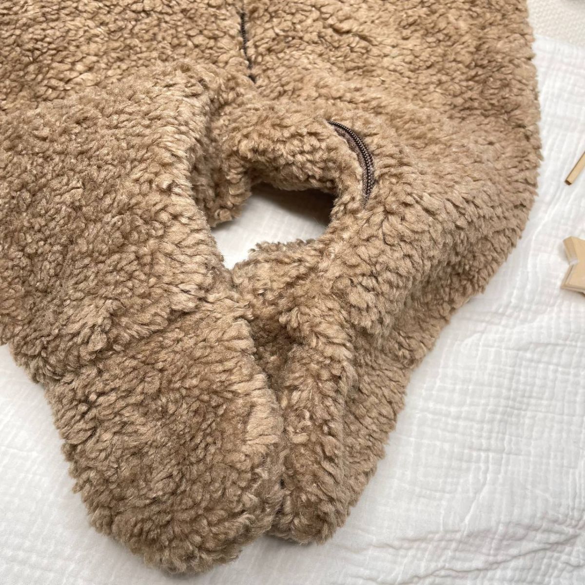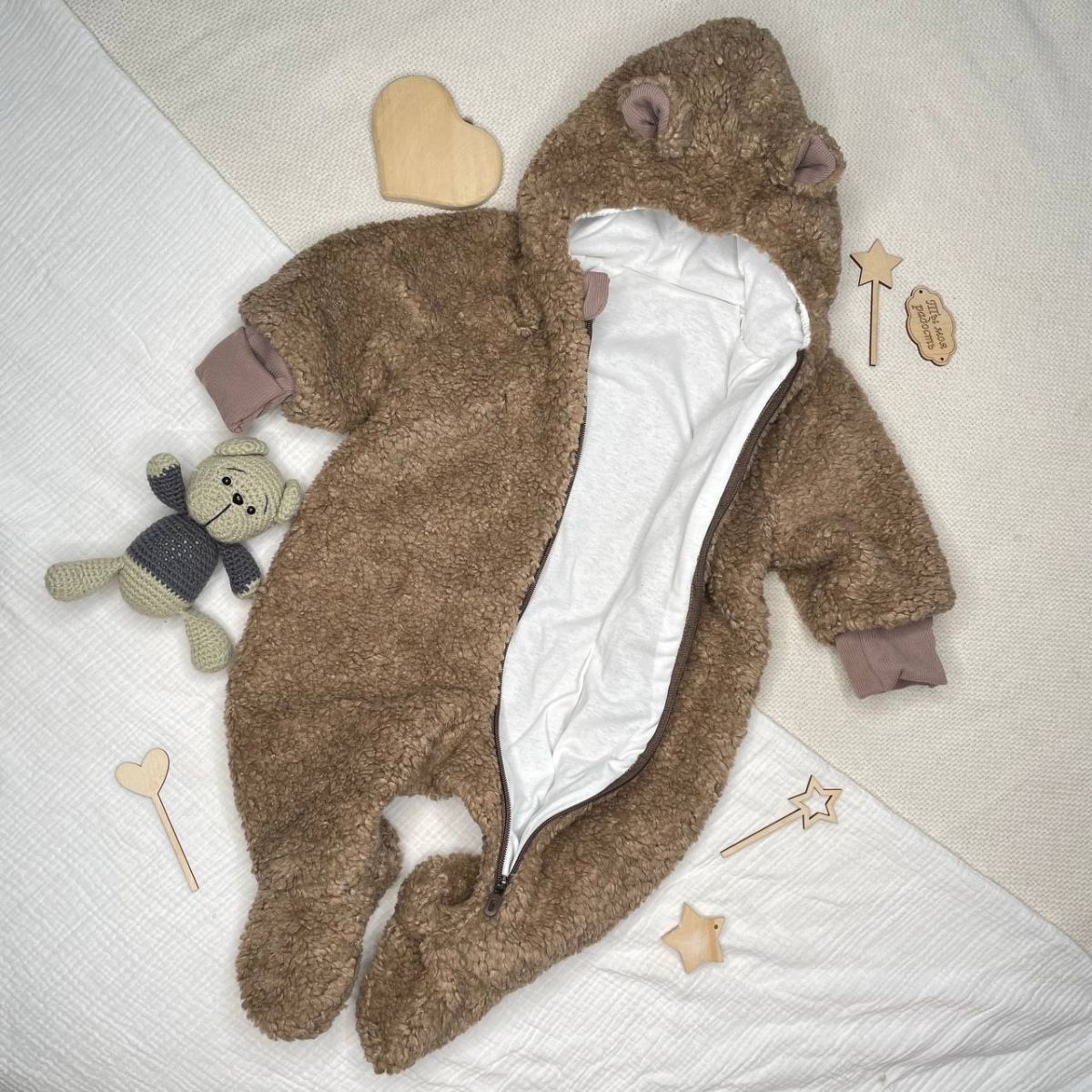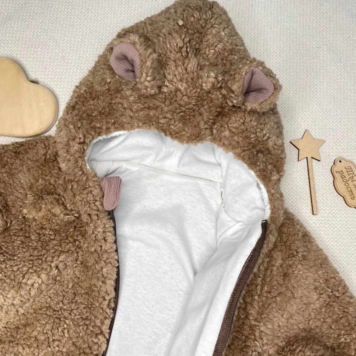 Комбинезон для новорожденных выполнен из нежной ткани "Барашек" (искусственная шерсть, гипоаллергенный материал). Он отлично держит тепло тела, а также не пропускает холод внутрь.