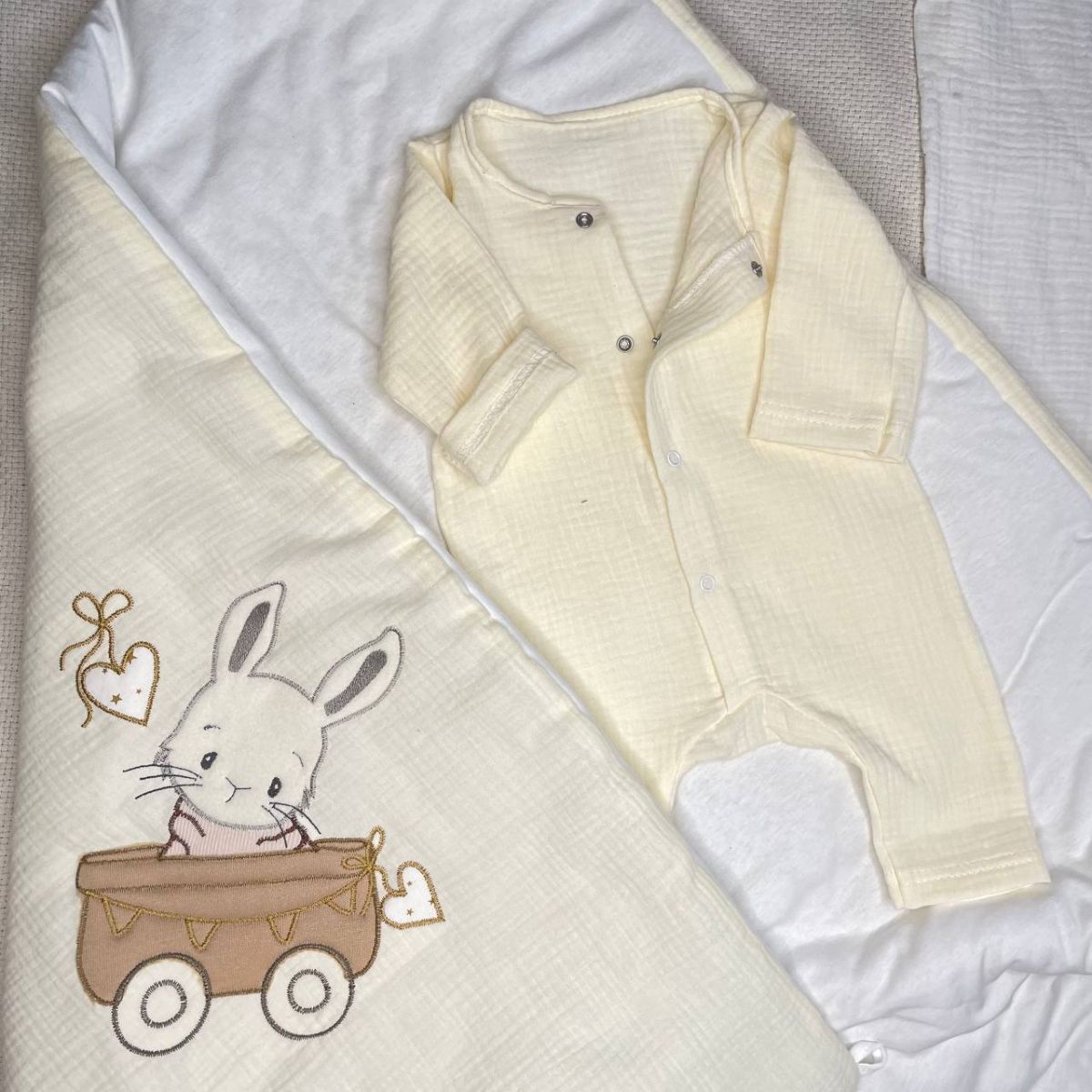 Муслиновый песочник для новорожденных имеет удобную застежку на кнопки спереди и округлый вырез горловины.