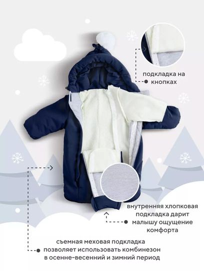 - съемная меховая подкладка позволяет использовать комбинезон как в осенне-весенний, так и в зимний период