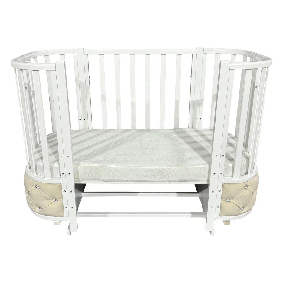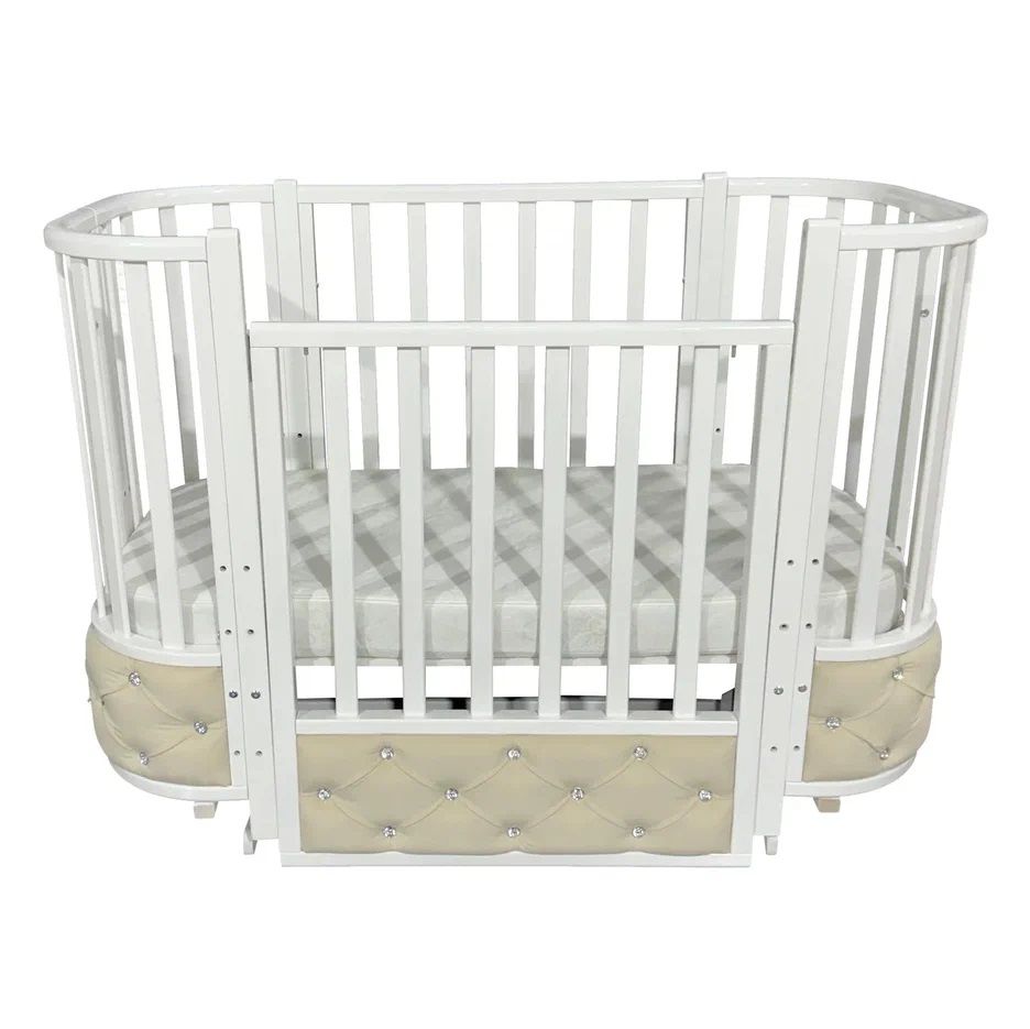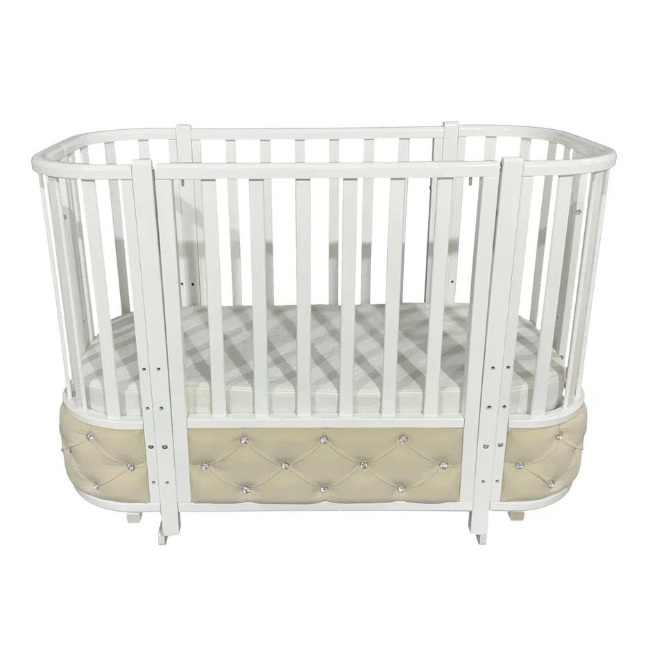Новая кроватка Estelle Elegance 4 ВЕЛЮР со вставками из велюра со стразами обладает стильным и современным дизайном. Переднее ограждение опускается вниз и фиксируется в двух положениях благодаря удобному механизму. Впоследствии переднее ограждение легко снимается через верх. Модель укомплектована поперечным маятником, благодаря чему можно укачивать малыша. Также в комплекте есть колеса со стопорами для удобного перемещения кровати по комнате. Колеса и маятник можно использовать только раздельно друг от друга. Модель трансформируется в диванчик и манеж. Спальное место составляет 120х60 см. Кровать выполнена из натуральных материалов и покрыта гипоалергенной краской, что абсолютно безопасно для Вашего малыша.