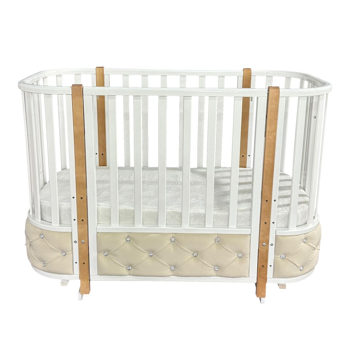 Новая кроватка Estelle Elegance 4 ВЕЛЮР со вставками из велюра со стразами обладает стильным и современным дизайном. Переднее ограждение опускается вниз и фиксируется в двух положениях благодаря удобному механизму. Впоследствии переднее ограждение легко снимается через верх. Модель укомплектована поперечным маятником, благодаря чему можно укачивать малыша. Также в комплекте есть колеса со стопорами для удобного перемещения кровати по комнате. Колеса и маятник можно использовать только раздельно друг от друга. Модель трансформируется в диванчик и манеж. Спальное место составляет 120х60 см. Кровать выполнена из натуральных материалов и покрыта гипоалергенной краской, что абсолютно безопасно для Вашего малыша.