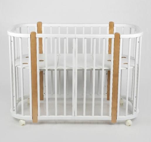 Трансформируется в колыбель 84*60 см, колыбель приставная 84*60 см, овальную кровать 120*60 см, манеж 120*60 см, диванчик 120*60 см.