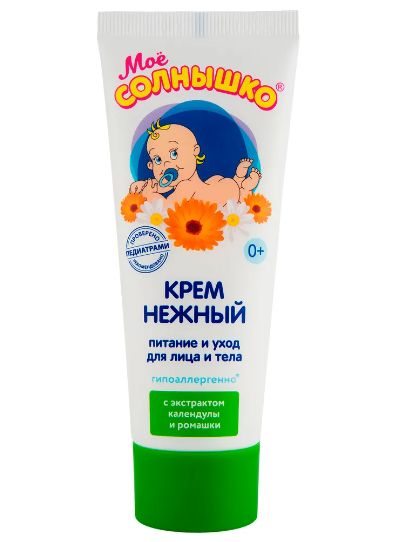 Гипоаллергенный состав крема Мое Солнышко "Нежный" 75мл с активными природными компонентами эффективно смягчает, увлажняет и успокаивает нежную детскую кожу, создает дополнительный защитный барьер. Предупреждает и устраняет раздражение и воспаление кожи. Клинически проверено и рекомендовано ФГУ «МНИИ Педиатрии и детской хирургии Минздрава России».