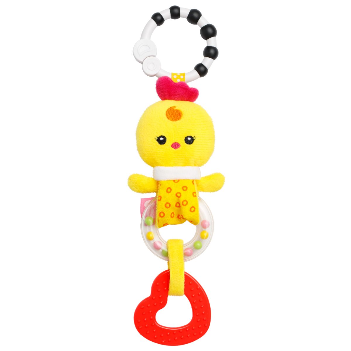 Игрушка имеет две погремушки, которые помогают в развитии внимания, а фигурный грызунок для детей позволяет справиться