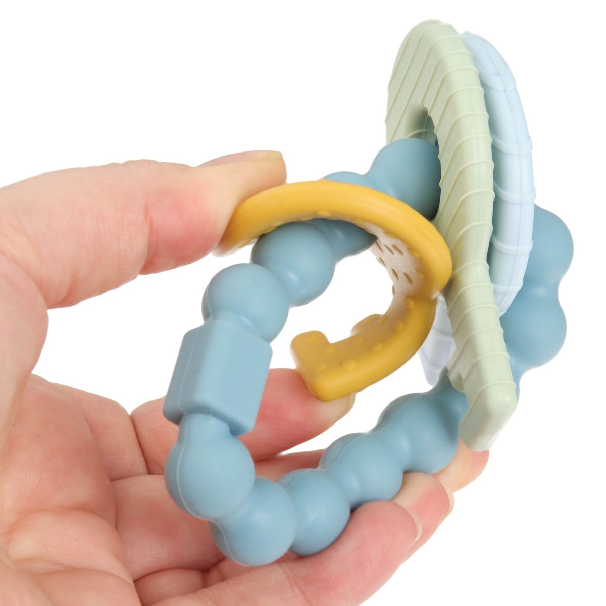 Прорезыватель снимает неприятные ощущения у малыша в период появления первых зубов. Также изделие подготовит ребёнка к процессу жевания, поспособствует формированию правильного прикуса и развитию мелкой моторики рук.